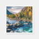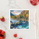 Paper napkins with a scenic photograph featuring tree covered mountains in autumn colours. A vibrant river flows around a multitude of rocks.