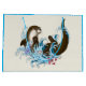 A cute brown river otter playing in the water with flowers in a cream coloured backdrop