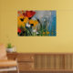 This evocative abstract artwork captures the feeling of a riverside meadow through rich texture, layered colour, and expressive brushwork. Warm bursts of red and golden yellow flowers rise from lush greens, while soft blues and misty greys suggest water, sky, and gentle reflections nearby. Thick paint application and visible palette-knife strokes give the piece a tactile, almost immersive quality, as if the scene is alive with breeze and movement.