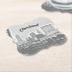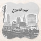Iconic skyline view of Cleveland, Ohio from the river, featured on stylish black and white beverage coaster. Unique way to show off a unique city!