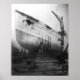 This old photo was a real mess but the image is too compelling to discard. I've cleaned up the photo. The image is very stylised but I've preserved as much detail as possible. The dots and scratches in the original were very distracting, and the lighting was terrible. By the way, RMS Aquitania was the world's last four-stack ocean liner.