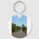 The keychain has a picture of a long straight road with small hills with a blue sky.