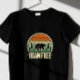 vintage-style t-shirt design featuring a retro sunset with layered sun rays, palm trees, and a garden and a bear , along with the phrase "ROAM FREE" 🌅🌴✨