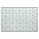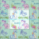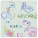 This fun fabric features two adorable baby dinosaur images, one in blue and one in lavender. Beside the dinosaur images is a bouquet of flowers, a pink heart, and the text "ROAR DINOSAUR" and "OH BABY!" The images are placed on a light blue green pastel background. Cute for a nursery or baby clothing, and is appropriate for either a baby girl or a baby boy.