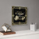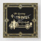 A black and gold art deco, roaring 1920's picture aof a man in a suit next to an antique car.