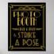 Bring roaring twenties glamour to your celebration with this Art Deco photo booth sign. Featuring bold gold typography and an elegant black background, it reads “Photo Booth: Grab a prop and strike a pose.” Perfect for weddings, Great Gatsby parties, cocktail hours, birthdays, or vintage-inspired events, this sign adds a fun and stylish focal point to your selfie station. Designed by The Arty Apples, this black-and-gold print combines classic Art Deco elegance with playful party energy, making it a memorable addition to any celebration.