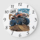 A vibrant and playful illustration for a children's monster truck t-shirt, featuring a large, colourful monster truck with oversized