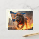 A fierce lion roars amid flames with a flag featuring the Star of David in the background