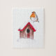Hand drawn illustration of a cute winter robin sitting on its house in snowy weather.