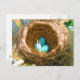 Picture of three turquoise blue robin eggs together not hatched yet in a brown, wood twig nest in a tree. Light colour tree bark in background with a few green leaves. I climbed a tree in my back yard for this photo, then photographed the birds a week later as they hatched, then fledged a week after that. I pruned some of the branches so that I had a clear shot at the nest. Digital photo.