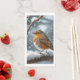 The robin, with its vibrant red breast, stands out like a cheerful burst of colour against the serene winter backdrop. The details of its feathers are intricately illustrated on the paper napkin, capturing the bird's natural beauty and the delicate nuances of its plumage. The robin appears content, its tiny form exuding a sense of resilience and warmth in the midst of the cold.