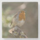 A European Robin (Erithacus rubecula) standing on a broken tree branch covered in lichens.