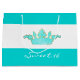 Large chic gift bag done in a robin's egg blue and white horizontal stripe pattern. Graphics of a blue and gold tone crown, decorates the middle of the bag. Personalise the white text, on the bottom of the bag to suit your occasion. Great for birthdays, Sweet 16, congratulations and Quinceañera.