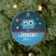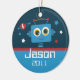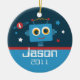 Cute little robot personalised 1st birthday ornament. Featuring a cute little robot head with giant eyes and antennae on his head. Surrounded by stars and a red planet with the number 1. Personalise it with your child's name and birthday or whatever you like! PinkInkArt original!