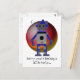A cool and slightly funny design featuring a royal blue robot in front of a shaded red and yellow sphere. A get well message for someone... customise as desired.