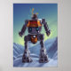 A metal robot walking in the snowy mountain, blue sky with a green light. This is a AI generated art piece.