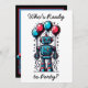 Personalised boy's birthday invitation with a robot theme. Colours are blue, red and black. A cartoon robot holding up red and blue balloons. Cute for any little boy who loves robots!