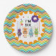 Robots 6th birthday party paper plates features four robots of blue, green, orange, and purple with lots of antennae, buttons, and lights, gears, text that reads I'm SIX, and a wide border of chevron stripes in blue, green, brown, white, and orange!