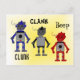 Three cool robots in blue, gray and yellow on a yellow shaded background. The words can be changed if so desired.