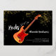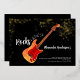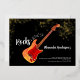 Gold glitter foil 50 Rocks rock and roll gold glitter 50th birthday party invitations with a cool electric guitar with orange fire flame pattern and red pick guard guitar art and musical notes illustration with personalised gold modern calligraphy typography on a black background. This easy to use template creates the perfect personalised invitation to celebrate fifty in rock n roll style and is ideal for a guitarist, musician and music lovers. Any guitar player will tell you that you can never have too many guitars. This cool unique modern musical instrument Original artwork by artist Catherine Sweetman