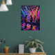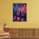 This painting captures a rock and roll band performing live on a brightly lit stage. The artwork is chraacterised by its heavy impasto texture, with thick, expressive brushstrokes that convey the energetic and dynamic atmosphere of a concert. Two guitarists are featured prominently in the foreground, while a bassist and a drummer can be seen in the background under vibrant blue, purple, and yellow spotlights. The entire scene is a celebration of music and performance.