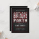 Party like a rockstar. Cool rock n roll inspired custom birthday invitation. Dark grey with black and red borders. Classic headbanger heavy metal style graphic of the words "birthday party."