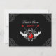 Unconventional RSVP card to be sent with the matching wedding invitation, on red, white and black featuring a rock and roll theme with illustration of electric guitars, wings and elegant baroque vintage ornaments.