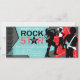 Party like a rock star! Aqua blue and red stars with kids singing and playing guitar: hip and cool rock star birthday party invites.