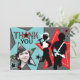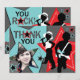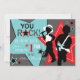 Party like a rock star! Aqua and red stars on grey background with boy singing and playing guitar rock star thank you card.