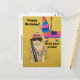 Bubba kitty in a Hawaiian shirt, party hat and blindfold, with a bat and pinata. Customisable birthday postcard.