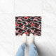 Rockabilly retro roller skating derby inspired pattern doormat. Cherries, roses, skates and dice on a gray ribbon and delicate polka dot background.