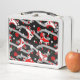 Rockabilly retro roller skating derby inspired pattern lunch box. Cherries, roses, skates and dice on a gray ribbon and delicate polka dot background.