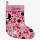Rockabilly themed pink Christmas stocking patterned with cute poodles, red cherries, playing cards and vinyl records. You can edit the text across the top to add your own name or message
