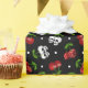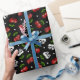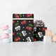 This gift wrap has rockabilly style cherries, skulls, dice, and polka dots on it.
