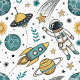 Playful rocket ships, planets, and stars in a vibrant space theme