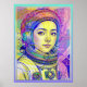 A vibrant psychedelic color palette of yellows, blues, pinks, and purples features a stylized portrait of a girl in an astronaut suit. The text 'ROCKET' is visible along the top border, and the text 'SCIENTIST' is visible down the right side. Perfect for the girl who one day dreams of exploring space!