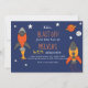 Join the fun with this playful rocket ship invitation. A great way to celebrate an outer space party! In orange and blue.