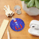 A blue and red rocket ship soars through space, in this young space lovers design!