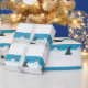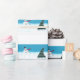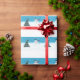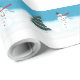 Painting of a Christmas tree and snowman dancing in the snow, is printed on wrapping paper.
