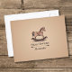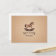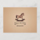 A birthday postcard with a gradient and textured beige background and an illustration of a handcrafted rocking horse in brown tones: a nice gift for a kid or lover of wooden toys!