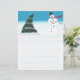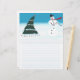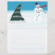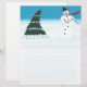 Painting of a Christmas tree and a snowman dancing in the snow is the large design on custom lined letterhead.