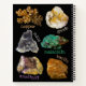 Photographs of dendritic copper, a geode half, muscovite mica, green malachite, purple amethyst crystals, and crested barite. All of these rocks are/contain minerals.