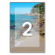 This beach design features a rocky shoreline. The picturesque setting combines greenery, blue ocean, rocky coastline and golden sand. The wording is elegantly framed with a simple white opaque border background. This is the perfect beach destination wedding design ideal for a summer or seaside wedding. Elegant and romantic beach wedding table number design with modern elements. Matching wedding invitations and other stationery items are also available. Customise the number and purchase each tables number individually according to how many table numbers you need.