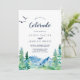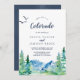This Rocky Mountain Colorado destination wedding invitation is perfect for an outdoor wedding. The design features a blue and green painted wilderness landscape with watercolor pine trees, birds and mountains. Customise this invitation for any mountain destination wedding location.