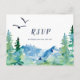 This Rocky Mountain menu choice RSVP postcard is perfect for an outdoor wedding. The design features a blue and green painted wilderness landscape with watercolor pine trees, birds and mountains. This wedding response postcard conveniently asks guests what meal they would like at your reception.