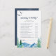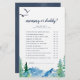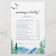 This rocky mountain "mummy or daddy" game is perfect for an outdoor baby shower. The design features a blue and green painted wilderness landscape with watercolor pine trees, birds and mountains. You can personalise the game questions by clicking the "customise" button.