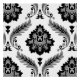A vintage style decorative damask surface pattern influenced by rococo classical design in black and grey details on a white background.