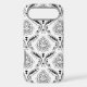 A vintage style decorative damask surface pattern influenced by rococo classical design in black line and leaf fill details on a white background.