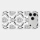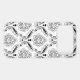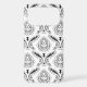 A vintage style decorative damask surface pattern influenced by rococo classical design in black line and leaf fill details on a white background.