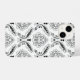 A vintage style decorative damask surface pattern influenced by rococo classical design in black line and leaf fill details on a white background.